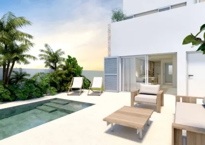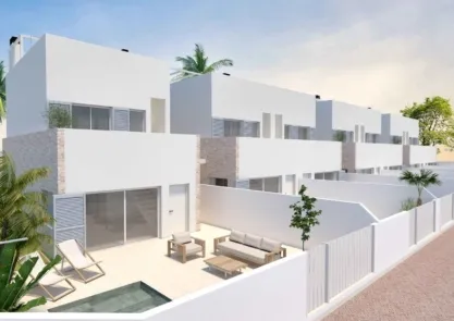 Portomarina Higuericas is a new residential complex in Torre de la Horadada, consisting of 3 types of properties: bungalows on the ground floor with their own private plot, bungalows on the upper floor with a private solarium, townhouses, and two independent villas. All properties have 3 bedrooms with built-in wardrobes and 2 fully equipped bathrooms. The kitchens are equipped with modern appliances, as well as heated floors in the bathrooms, living room, and kitchen. All properties have a private pool and 1 parking space.