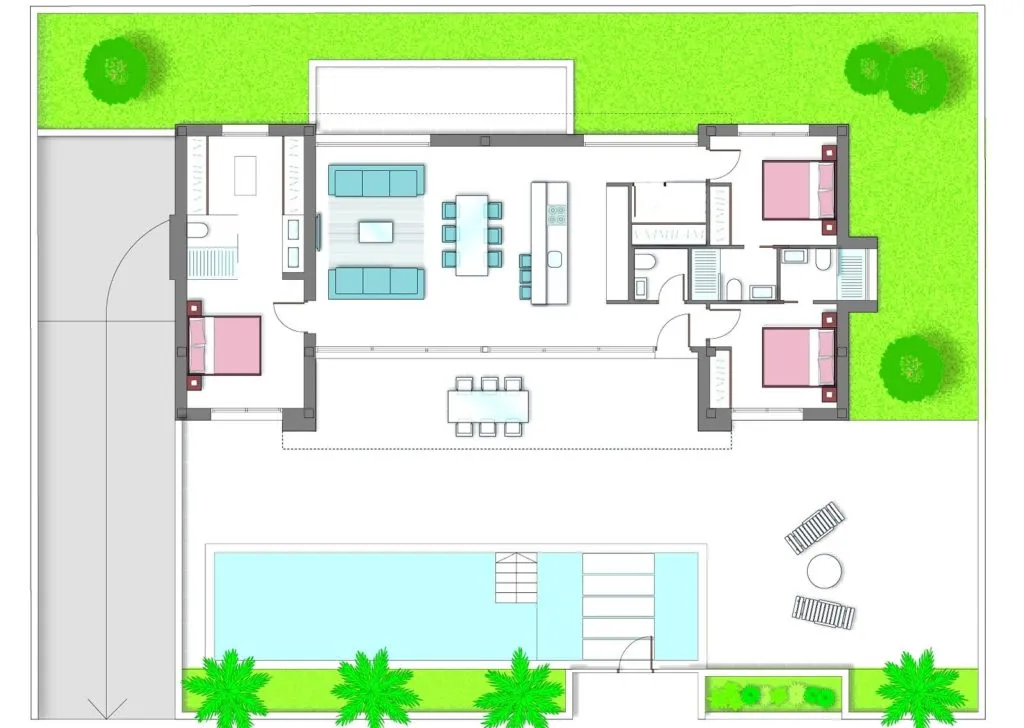 3 просторные спальни, 2 ванные комнаты, кухня открытого типа, гостиная-столовая, бассейн 5 х 2,50 м, частная парковка.
