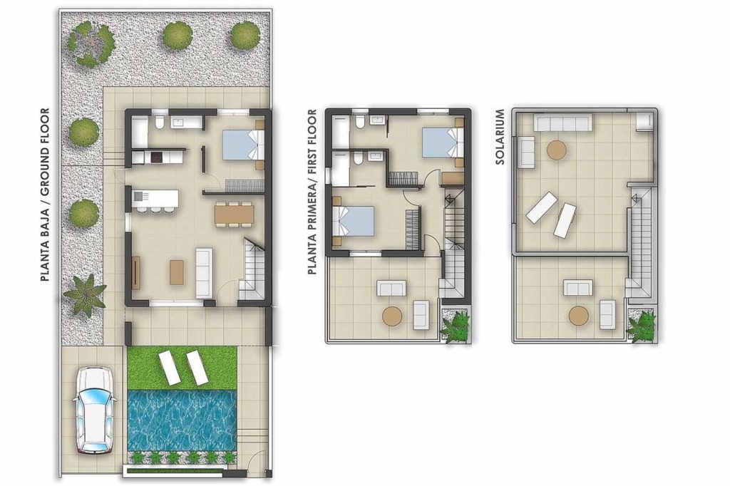 Все участки ровные с площадью от 390 м2 до 650 м2 и имеют частный бассейн и ухоженный сад, где можно весело провести время и насладиться теплом средиземноморского климата. В домах есть три просторные спальни и гостиная-столовая с открытой кухней и выходом на террасу перед домом. На верхнем этаже предусмотрен большой солярий.