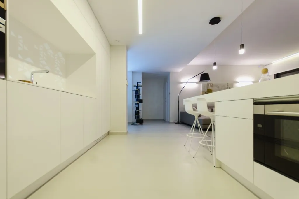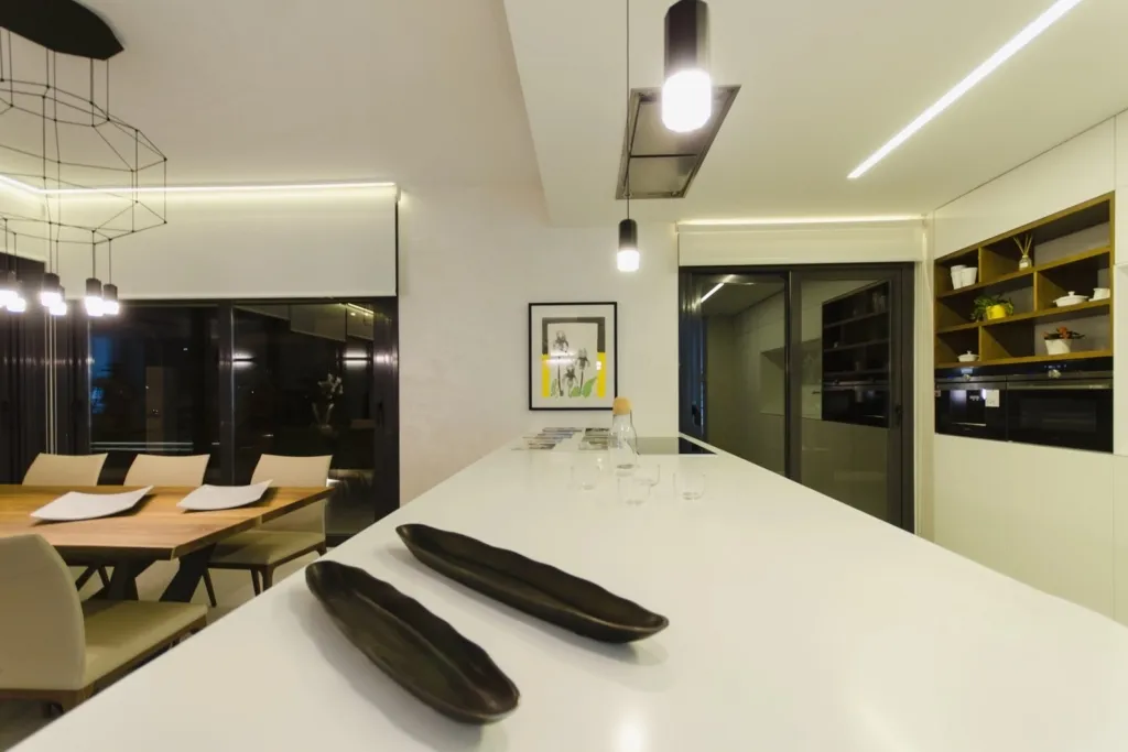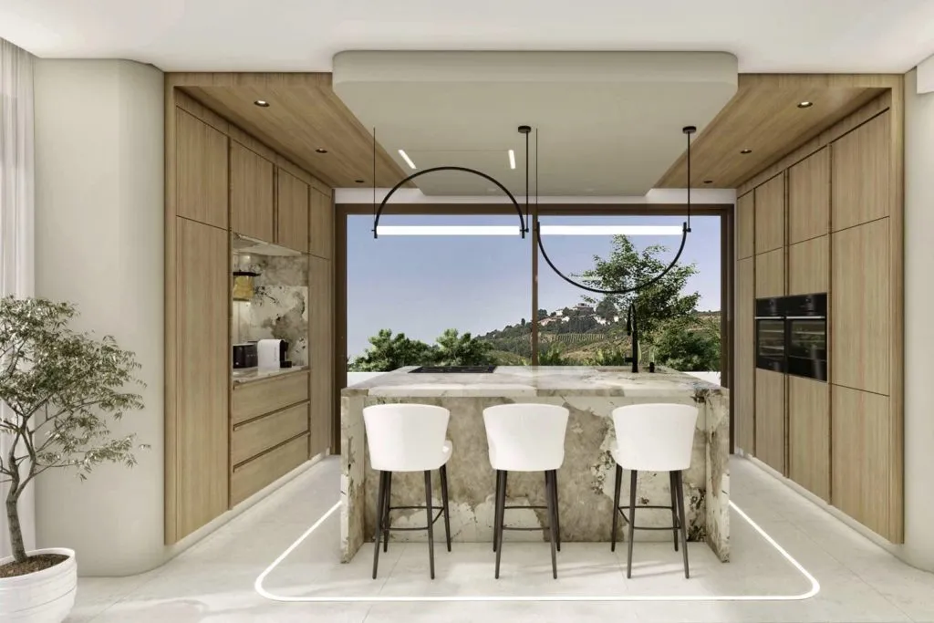 Впечатляющая прихожая с потолками высотой 6 метров (!!!) и современной лестницей, ведущей на второй этаж. Гостиная площадью 62,73 м2 и полностью оборудованная кухня с большим островом (1,20 x 3,06) просто огромны.