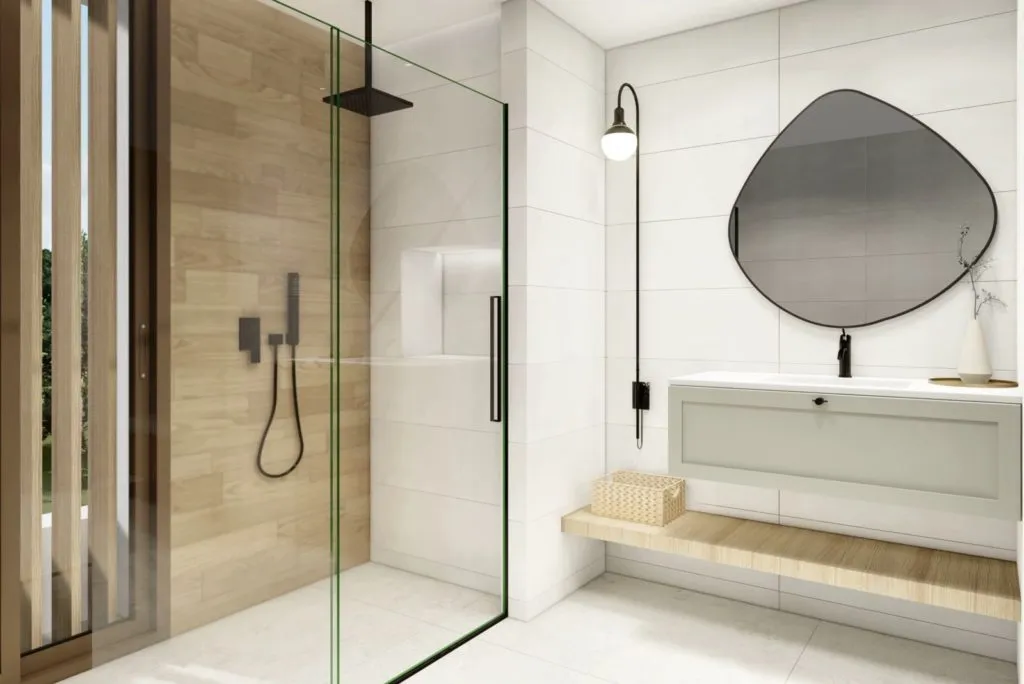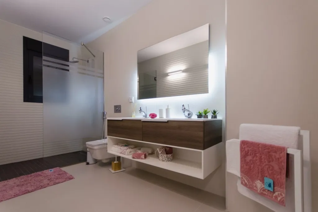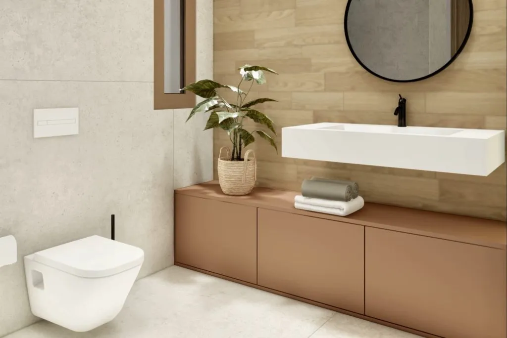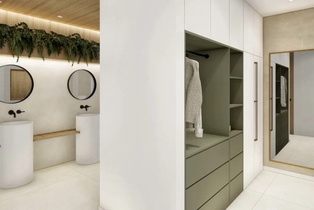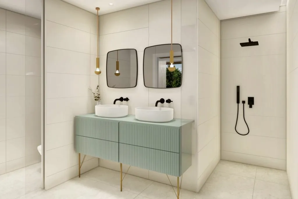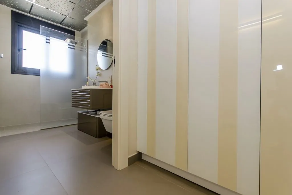 Базовые шкафы в ванной комнате и туалете. Внутренние двери во всю высоту, бронированная дверь антрацитового цвета с вертикальной ручкой из нержавеющей стали.