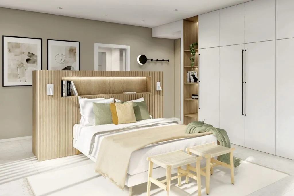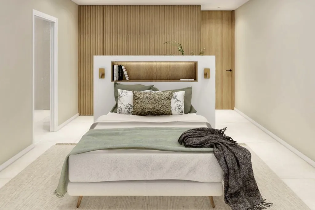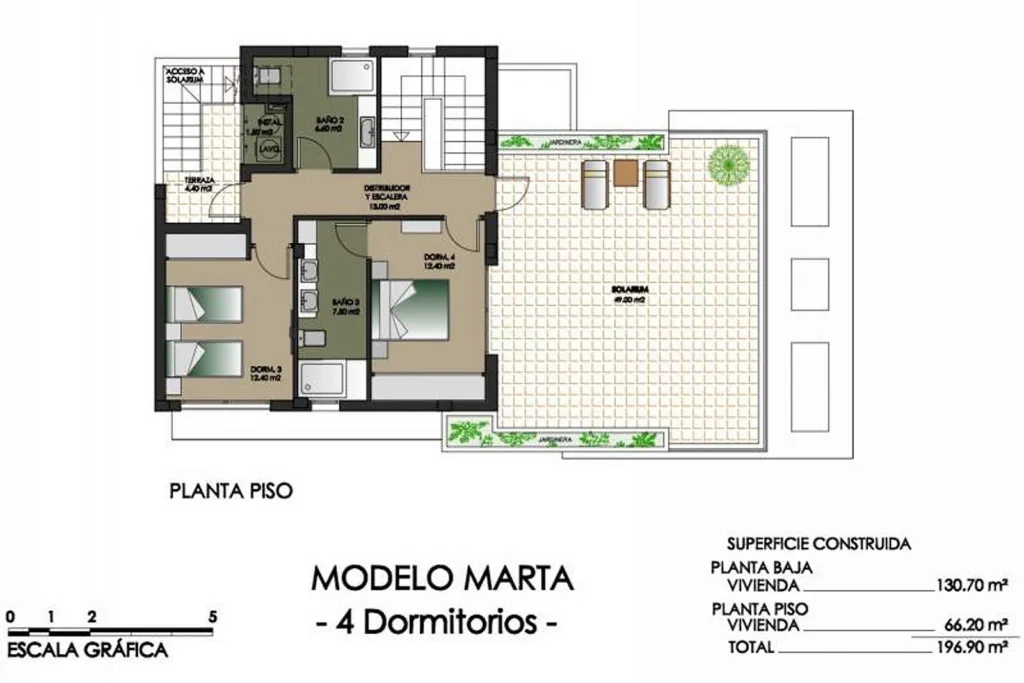 На втором этаже находится вторая спальня (22,30 м2) с ванной комнатой и еще две спальни, каждая площадью 12 м2, с общей третьей ванной комнатой.