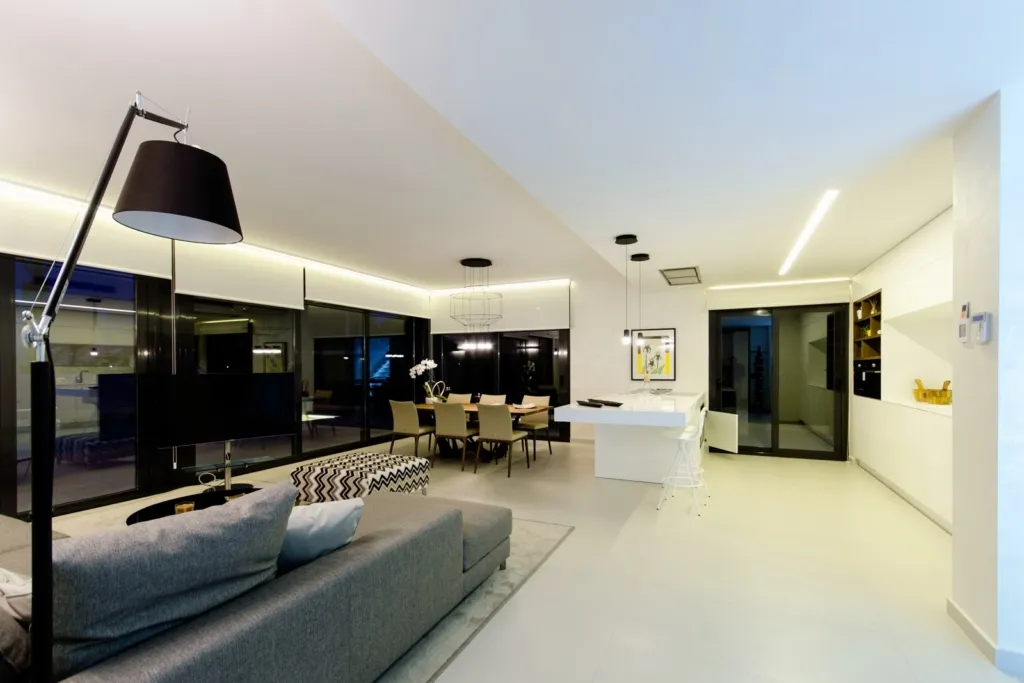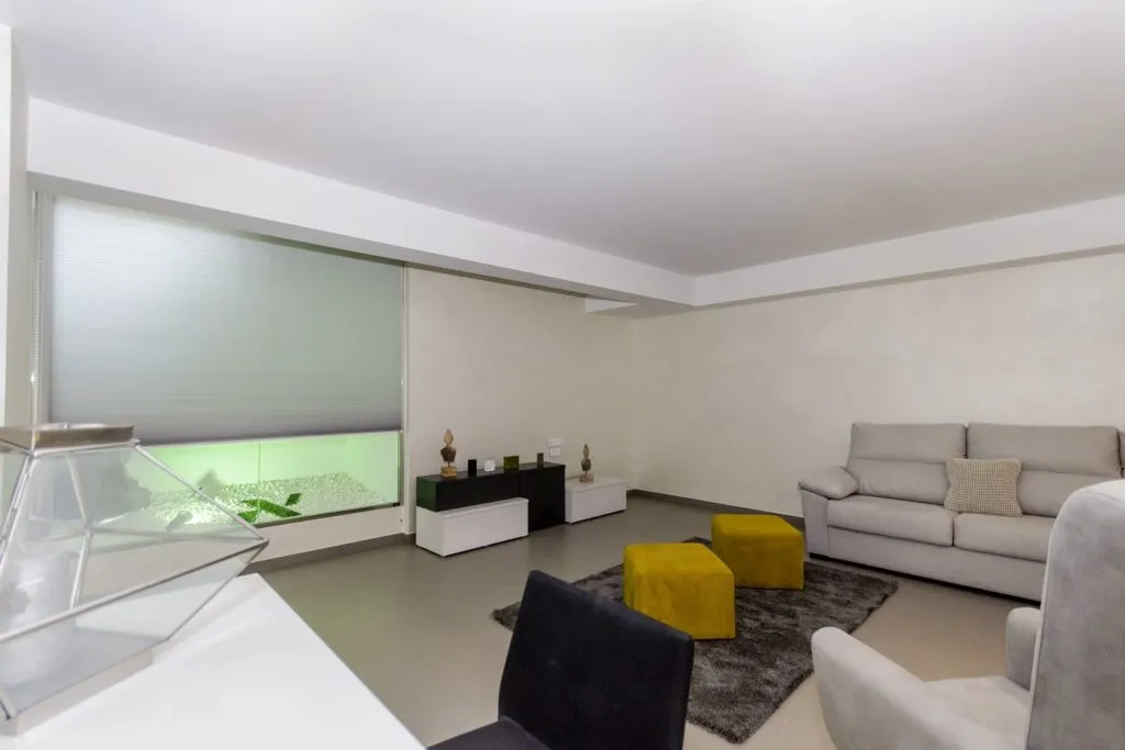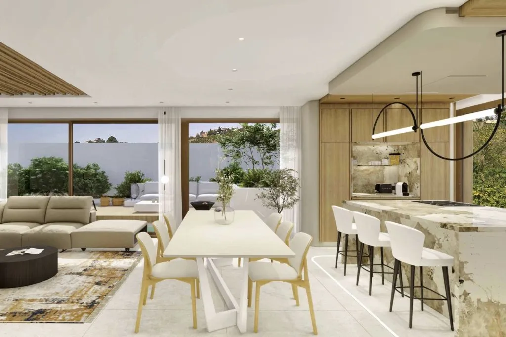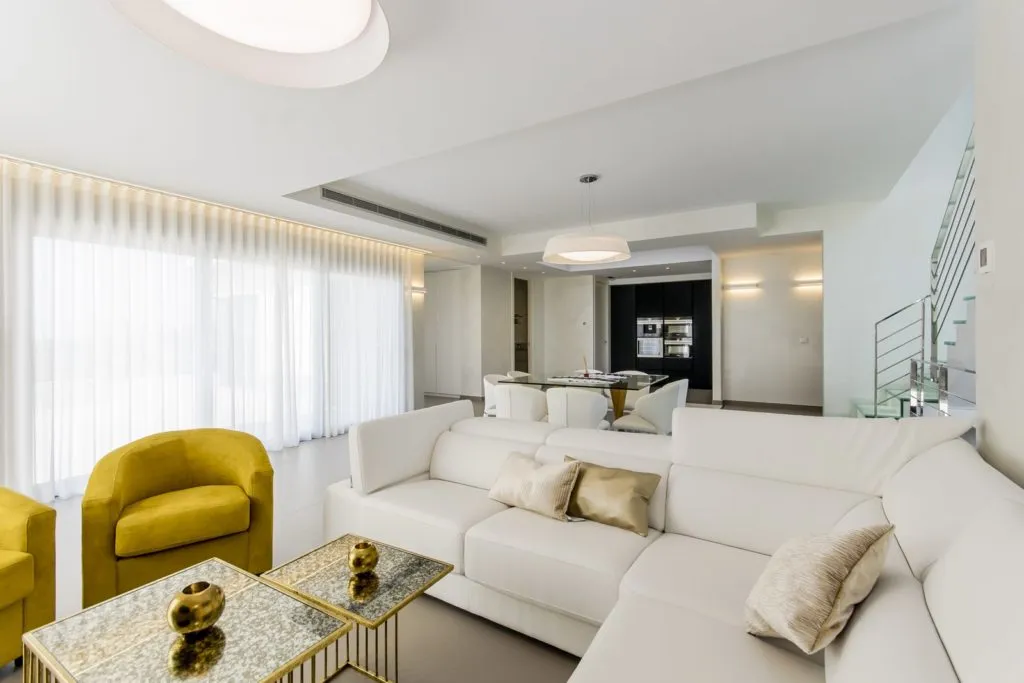 Из светлой и просторной гостиной есть прямой выход на террасу и к бассейну.