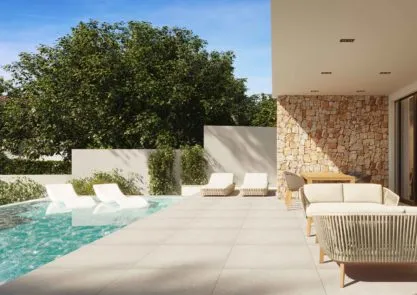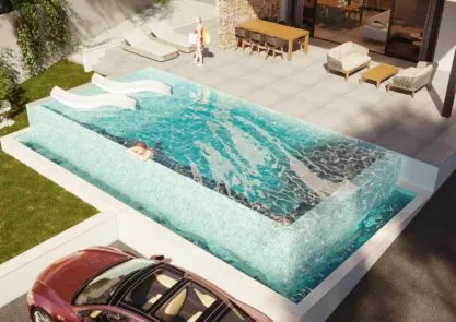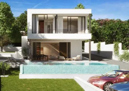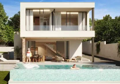 Внешнее пространство также впечатляет — огромный бассейн с переливом и джакузи общей площадью 38 м2, душ и ухоженный сад с соснами создадут атмосферу спокойствия и уюта. Виллы находятся в пешей доступности от всех необходимых услуг для жизни услуг, включая магазины, банки и рестораны.