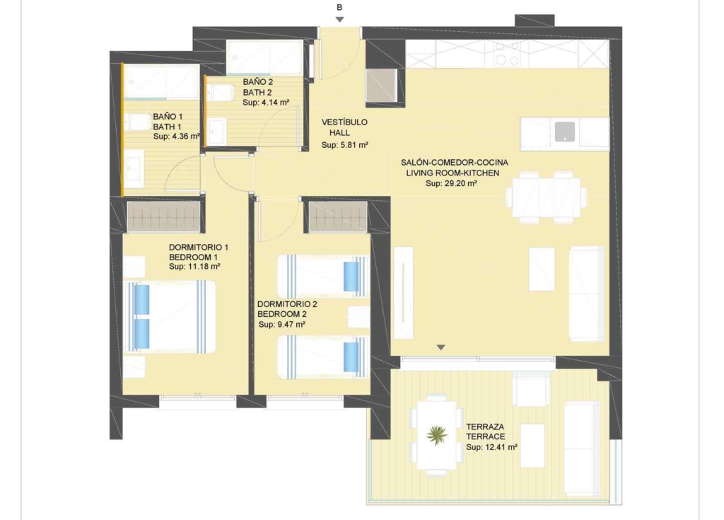 Все апартаменты с 3 спальнями с большими террасами. Частное парковочное место включено в стоимость! С верхних этажей открывается панорамный вид на море и долину Вега Баха.