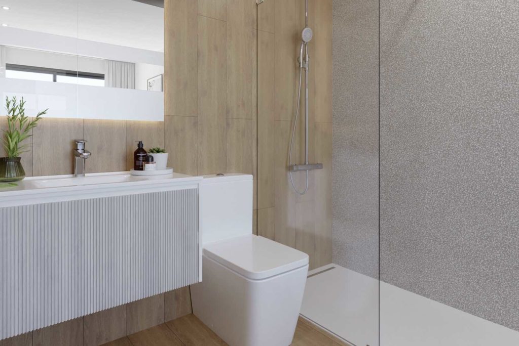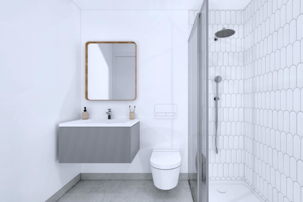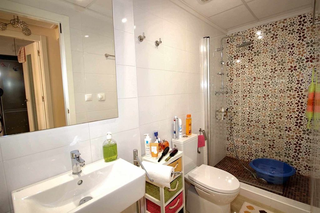 Полностью оборудованные ванные комнаты с умывальником, зеркалом, душем со стеклянной перегородкой, электрической сушилкой для полотенец.
